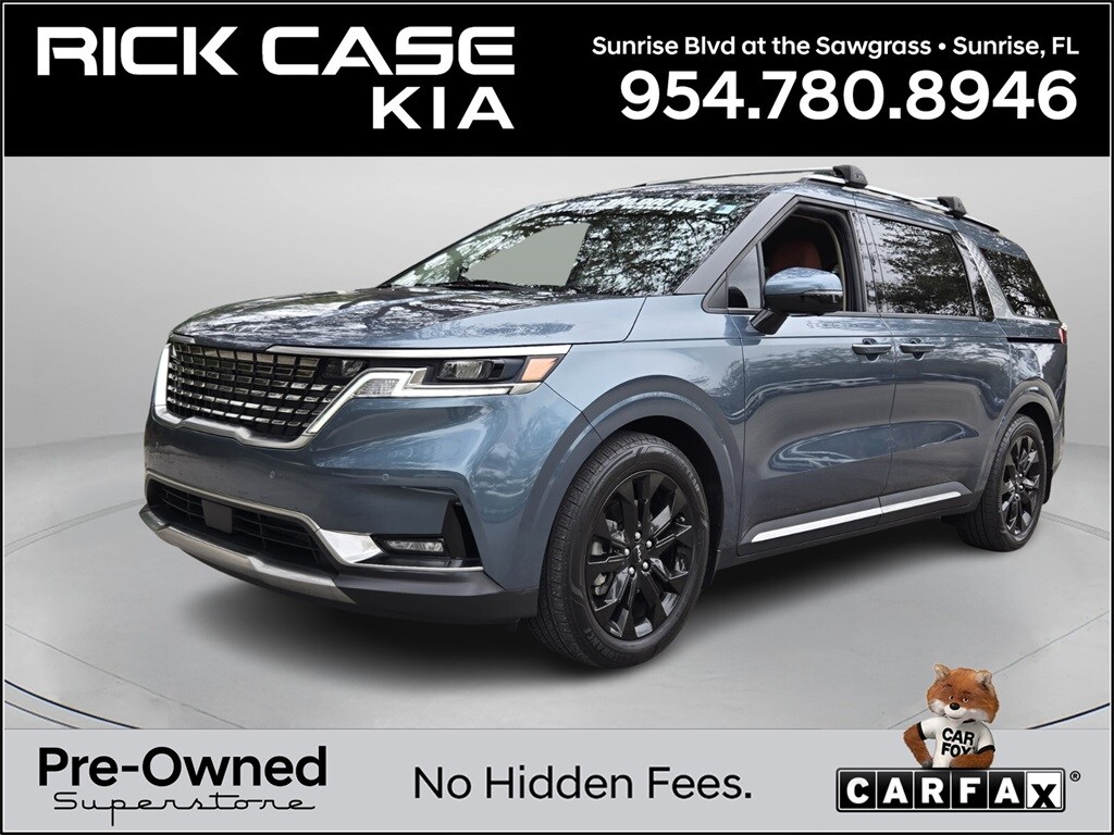 Recent Arrival! CARFAX One-Owner. Clean CARFAX. 150 Point Inspection, Bluetooth, iPod Connector, Kia Certified, Leather, Navigation, BACK UP CAMERA, Unlimited Car Wash, Rick Case Rewards, 4-Wheel Disc Brakes, ABS brakes, Air Conditioning, Apple CarPlay & Android Auto, Dual front impact airbags, Dual front side impact airbags, Emergency communication system, Exterior Parking Camera Rear, Front anti-roll bar, Heated & Ventilated Front Bucket Seats, Knee airbag, Low tire pressure warning, Memory seat, Occupant sensing airbag, Overhead airbag, Power Liftgate, Rear anti-roll bar, Tachometer, Telescoping steering wheel, Tilt steering wheel, Trip computer. Certified. Astra Blue 2024 Kia Carnival SX FWD 8-Speed Automatic V6 Kia Certified Pre-Owned Details: