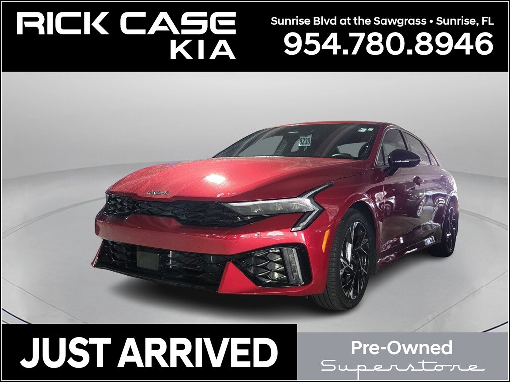Priced below KBB Fair Purchase Price! CARFAX One-Owner. Clean CARFAX. 150 Point Inspection, Bluetooth, iPod Connector, Kia Certified, Navigation, BACK UP CAMERA, Unlimited Car Wash, Rick Case Rewards, 6 Speakers, Air Conditioning, AM/FM radio: SiriusXM, Dual front side impact airbags, Emergency communication system: Kia Connect (includes 1 year free trial), Four wheel independent suspension, Front anti-roll bar, Knee airbag, Low tire pressure warning, Navigation System, Occupant sensing airbag, Overhead airbag, Radio: AM/FM Audio System, Rear anti-roll bar, Rear side impact airbag, Rear window defroster, Speed-sensing steering, Traction control, Wheels: 18" x 7.5J Gloss Black Machined Finish Alloy. Certified. Runway Red 2025 Kia K5 GT-Line FWD 8-Speed Automatic I4