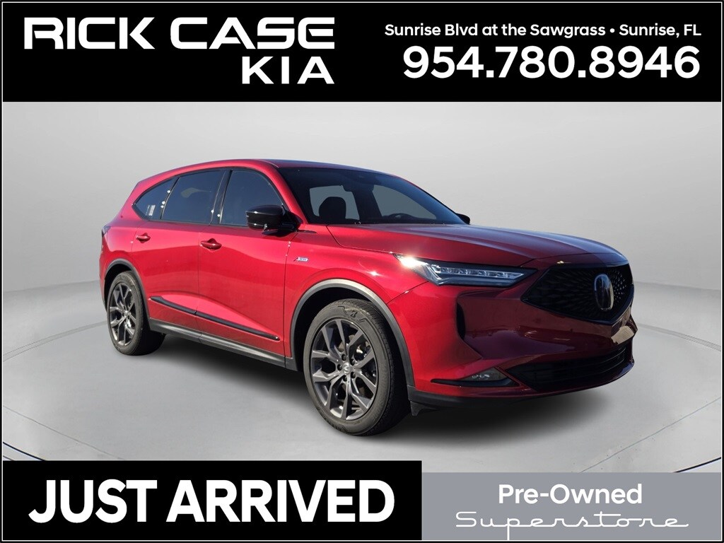 Recent Arrival! CARFAX One-Owner. Clean CARFAX. 150 Point Inspection, Bluetooth, iPod Connector, Kia Certified, Leather, Navigation, BACK UP CAMERA, Unlimited Car Wash, Rick Case Rewards, 16 Speakers, 4-Wheel Disc Brakes, ABS brakes, Anti-whiplash front head restraints, Apple CarPlay/Android Auto, Dual front impact airbags, Dual front side impact airbags, Emergency communication system: AcuraLink, Front anti-roll bar, Heated front seats, Knee airbag, Low tire pressure warning, Navigation system: Acura Navigation System with 3D View, Occupant sensing airbag, Overhead airbag, Panic alarm, Power Liftgate, Power moonroof, Radio data system, Radio: ELS Studio 3D Premium Audio System, Rear anti-roll bar, Security system, Trip computer, Ventilated front seats. Red 2023 Acura MDX A-Spec SH-AWD AWD 10-Speed Automatic 3.5L V6 SOHC i-VTEC 24V