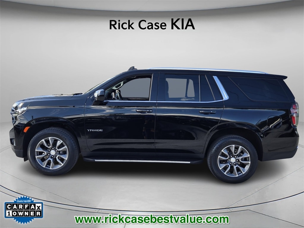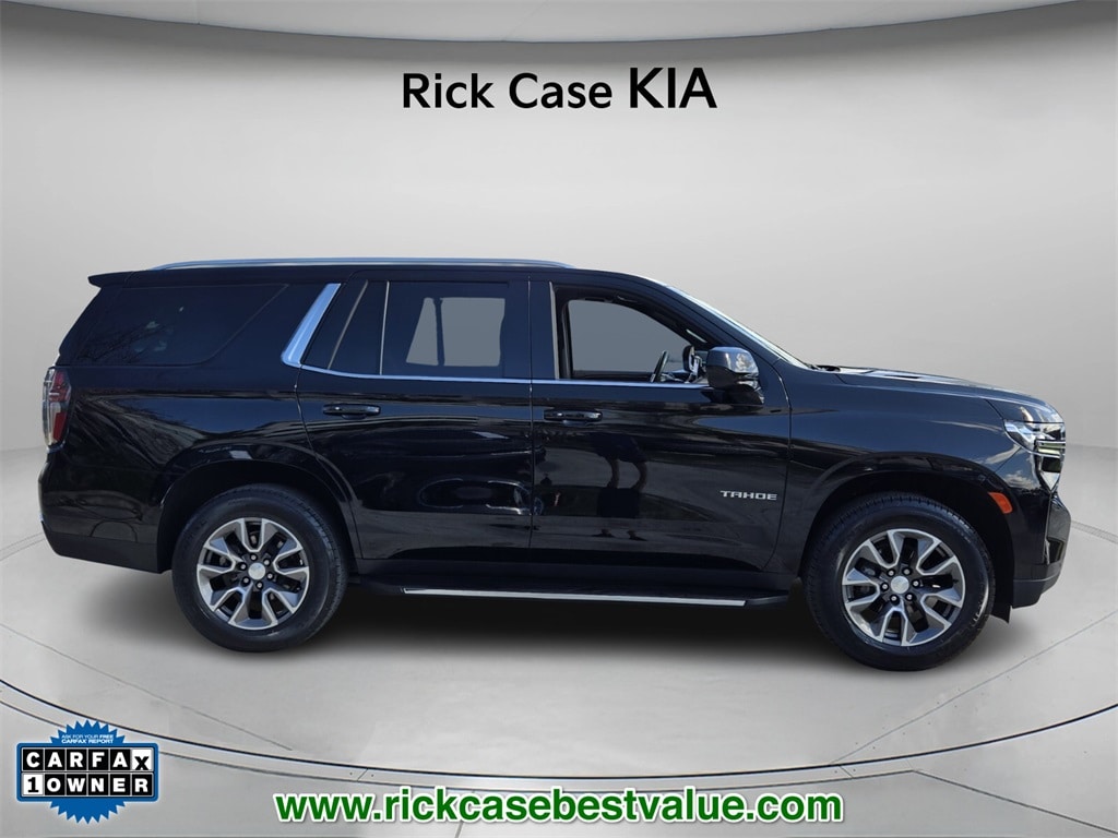Priced below KBB Fair Purchase Price! CARFAX One-Owner. Clean CARFAX. 10 year or 100,000 mile Powertrain Warranty, 150 Point Inspection, Unlimited Car Wash, Rick Case Rewards, 10-Way Power Driver & Passenger Seat Adjusters, 1st & 2nd Row Color-Keyed Carpeted Floor Mats, Alloy wheels, Auto-Dimming Inside Rear-View Mirror, Automatic Stop/Start, Bose 9-Speaker Stereo Audio System Feature, Brake assist, Bright Front & Rear Door Sill Plates, Color-Keyed Carpeting Floor Covering, Driver & Front Outboard Passenger Airbags, Electronic Stability Control, Enhanced Driver Information Center, Floor Console w/Storage Area, Hands-Free Rear Power Programmable Liftgate, Infotainment Display, Leather-Wrapped Steering Wheel, LED Daytime Running Lamps, Memory Settings for Driver, Navigation System, Power Liftgate, Preferred Equipment Group 1LT, Remote Start, SiriusXM Radio w/360L, Speed control, Start/Stop System Disable Button, Universal Home Remote, Wheels: 20" x 9" Painted Aluminum, Wireless Charging. Black 2022 Chevrolet Tahoe LT RWD 10-Speed Automatic with Overdrive EcoTec3 5.3L V8