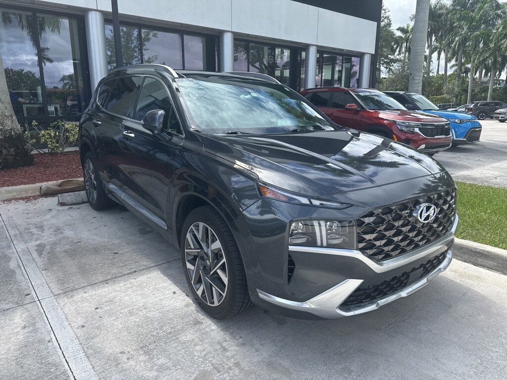Recent Arrival! CARFAX One-Owner. Clean CARFAX. 10 year or 100,000 mile Powertrain Warranty, 150 Point Inspection, Unlimited Car Wash, Rick Case Rewards, 4-Wheel Disc Brakes, ABS brakes, Alloy wheels, Apple CarPlay & Android Auto, Auto-dimming Rear-View mirror, Automatic temperature control, Brake assist, Delay-off headlights, Electronic Stability Control, Front dual zone A/C, Fully automatic headlights, Heads-Up Display, Heated & Ventilated Front Bucket Seats, Memory seat, Navigation System, Option Group 01, Panic alarm, Power driver seat, Power Liftgate, Power moonroof, Quilted Premium Nappa Leather Seat Trim, Security system, Speed control, Wheels: 20" x 8.0J Alloy. Portofino Gray 2022 Hyundai Santa Fe Calligraphy FWD Shiftronic 2.5L I4